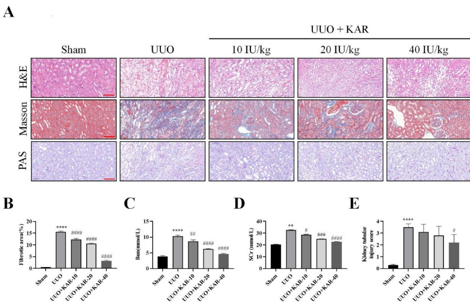 通过经典的肾功能指标检测发现,与模型组相比,KAR治疗组血清尿素氮(BUN)和肌酐(SCr)水平显著降低。组织病理学分析显示,KAR各剂量组肾小管损伤评分明显改善,Masson染色显示的纤维化面积随剂量增加而递减,其中高剂量组(40 IU/kg)效果最为显著。