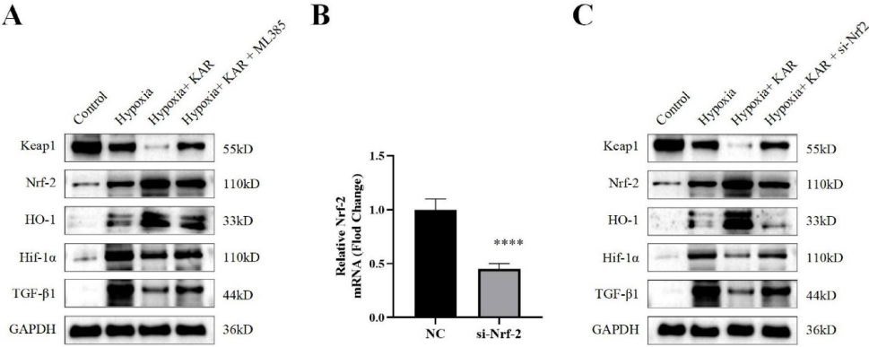 研究最关键的发现是揭示了KAR的作用靶点。在UUO模型和细胞实验中,KAR处理均能降低Keap1和缺氧诱导因子-1α(Hif-1α)的表达,同时上调Nrf-2及其下游血红素加氧酶-1(HO-1)的水平。当使用Nrf-2特异性抑制剂ML385或siRNA敲低Nrf-2时,KAR的保护作用被显著削弱,这直接证明了Keap1/Nrf-2通路的核心地位。