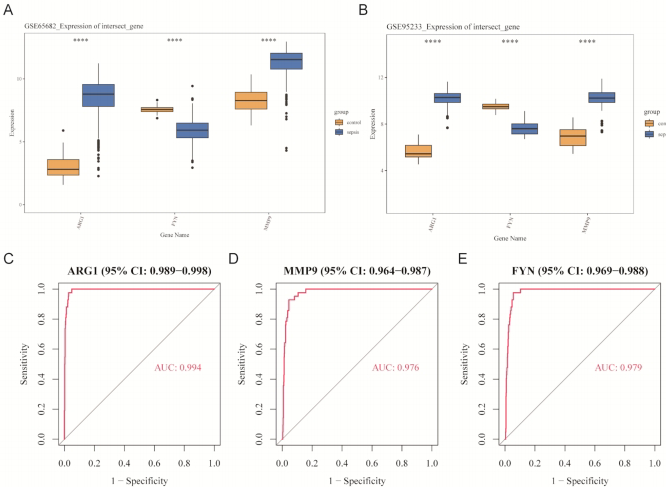 候选基因鉴定:通过差异表达分析筛选760例脓毒症血液样本,机器学习交叉验证锁定MMP9/ARG1/FYN核心基因集。其中金属蛋白酶MMP9和精氨酸酶ARG1显著上调,酪氨酸激酶FYN异常下调。