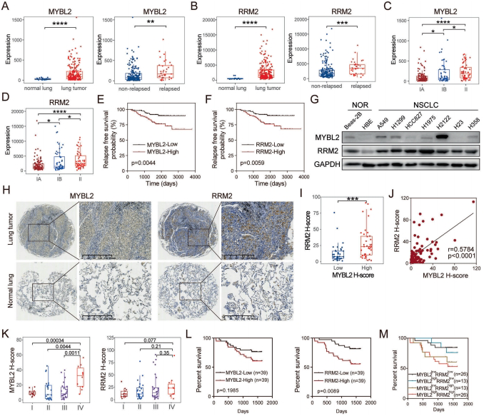 通过对TCGA和独立队列(GSE31210、GSE30219)的分析,发现MYBL2-RRM2高表达与肺癌分期进展和不良预后显著相关。组织微阵列显示,MYBL2与RRM2蛋白表达呈强正相关(r=0.82),且双高表达患者中位生存期缩短达40%,这为靶向该通路提供了临床依据。