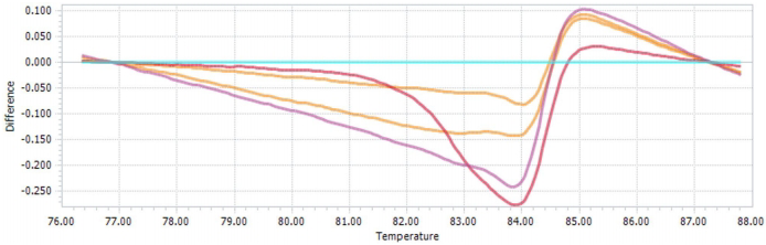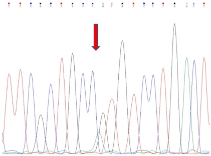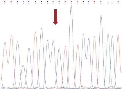 研究采用特异性引物扩增GNAS基因目标区域,通过熔解曲线差异成功区分野生型(GG)与杂合突变型(GA)。如图1所示,差异图中底部红色/粉色曲线代表GA基因型,中部蓝色基线为GG型。测序结果直观显示602位点G>A的碱基替换(图2箭头处),而野生型样本则保持GG纯合状态(图3)。