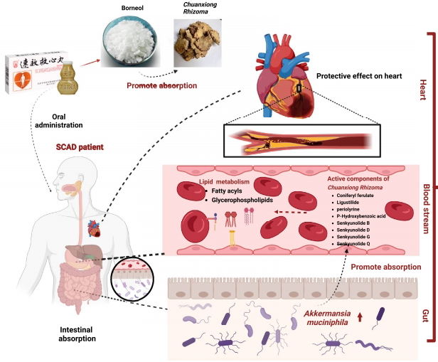 心血管疾病(CVD)已成为全球健康的首要威胁,其中稳定型冠心病(SCAD)因血栓形成等病理过程需要长期用药。虽然硝酸酯类等西药是主流治疗方案,但存在化学成分单一、靶点有限和长期不良反应等问题。传统中药速效救心丸(SJP)作为活血化瘀代表方剂,由川芎(Chuanxiong Rhizoma, CR)和冰片(Borneol, Bor)组成,临床证实对SCAD疗效显著,但其"活血-开窍"配伍的协同机制尚未阐明。近年研究发现肠道菌群-宿主代谢互作在SCAD发病中起关键作用,而SJP能改善急性心肌梗死模型动物的肠道菌群并纠正脂代谢紊乱,这为揭示其配伍机制提供了新思路。