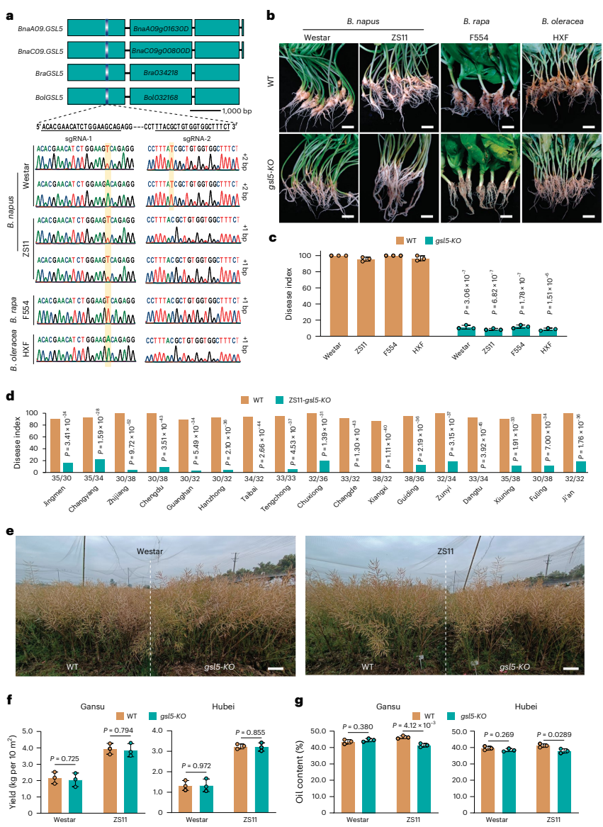 在四种作物中敲除GSL5均获得高水平抗性:甘蓝型油菜gsl5植株对17个分离株(15种致病型)完全抗病;白菜和花椰菜gsl5植株对7个测试分离株均抗病。田间试验表明,ZS11-gsl5在染病田产量比野生型提高2倍,且在无病田关键农艺性状无显著差异(如Westar-gsl5产量2.08 vs 2.17 kg/10m2)。