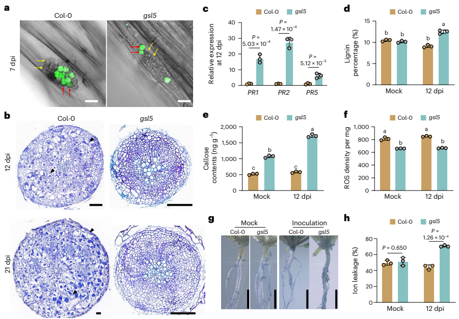显微观察发现gsl5植株能完成初级感染,但次级感染的皮层细胞中病原体生长受阻。转录组和代谢分析显示,gsl5植株在次级感染早期(12 dpi)JA前体OPDA、JA及其活性衍生物JA-Ile含量分别增加2倍、3倍和2.3倍,且PR2、PR5等防御基因表达上调6倍。双突变体实验证实jar1-1(JA缺陷)完全恢复gsl5感病性,而sid2-1(SA缺陷)无影响。外源MeJA处理显著降低野生型病害严重度。