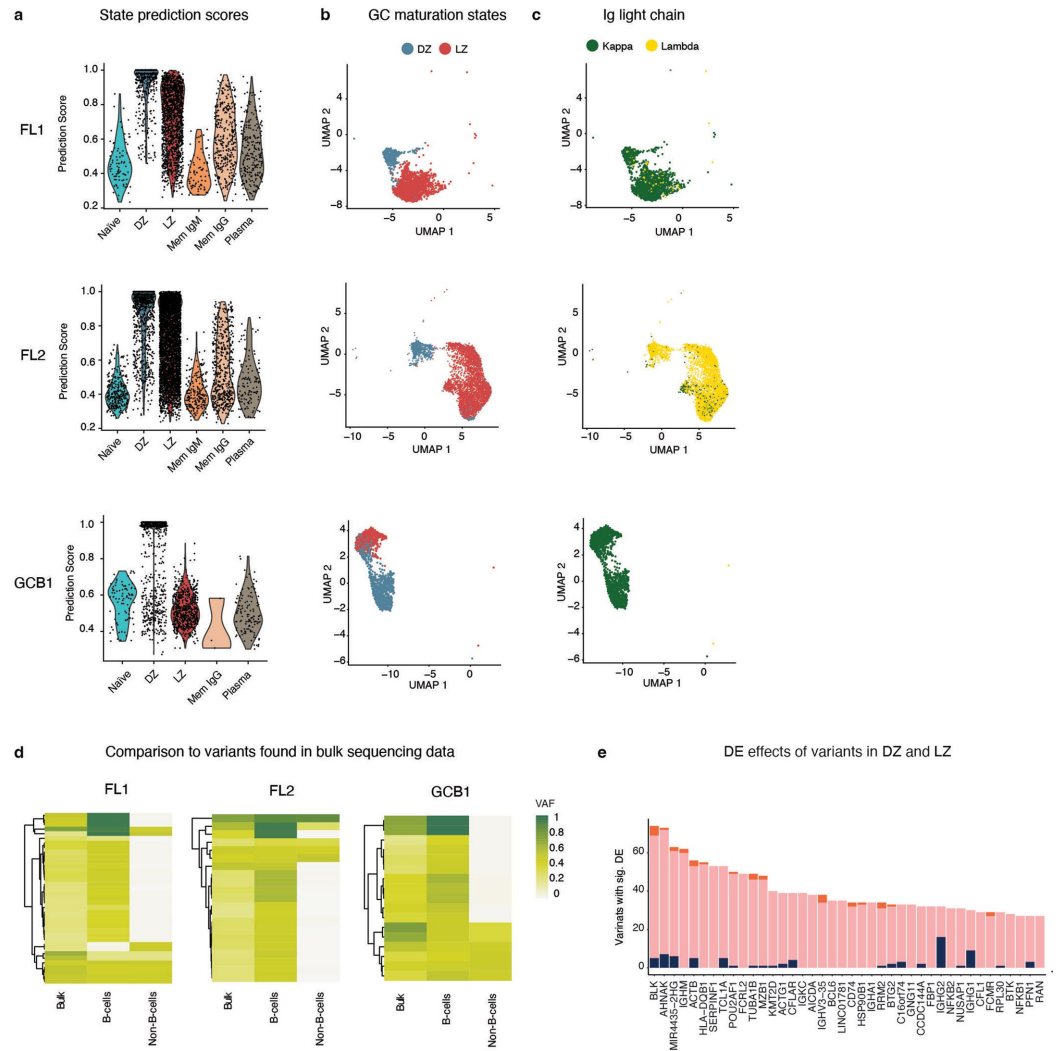 【B cell lymphoma variants linked to tumorigenic expression】部分展示了临床应用价值。在滤泡性淋巴瘤(FL)和弥漫大B细胞淋巴瘤(GCB)样本中,SDR-seq成功解析了暗区(DZ)和明区(LZ)细胞的克隆演化,发现BCL2变异在LZ显著富集(P<0.05)。高突变负荷细胞显示B细胞受体(BCR)信号通路激活,为肿瘤免疫逃逸机制提供新见解。
