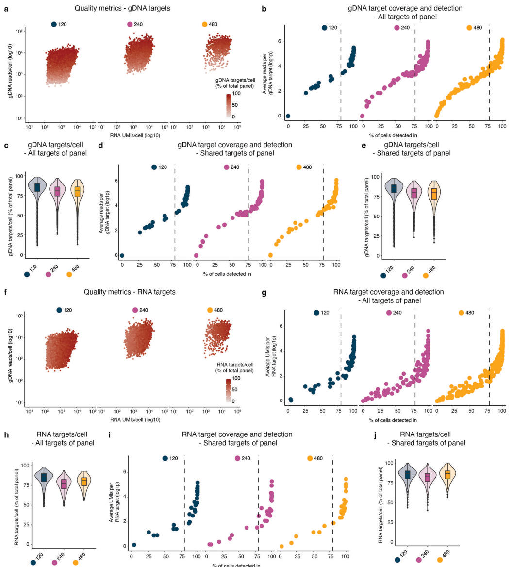 【SDR-seq is scalable to hundreds of gDNA loci and genes】展示了技术扩展性。在120-480个靶标的面板测试中,80%gDNA目标在>80%细胞中稳定检出,等位基因丢失率仅6-13%,显著优于现有技术。染色质状态分析表明,不同调控元件(如增强子dELS)的检测效率无显著差异。
