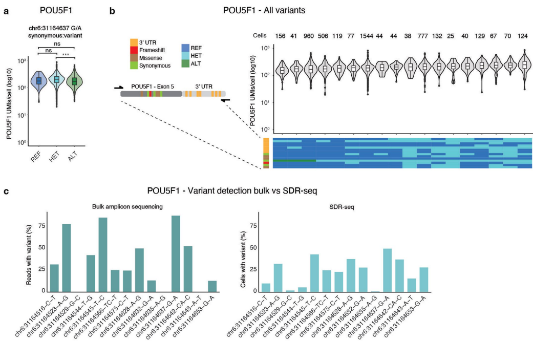 【SDR-seq confidently detects gene expression changes】通过CRISPRi和碱基编辑(BE)验证灵敏度。靶向转录起始位点(TSS)的gRNA使95%目标基因表达显著下调,而24%eQTLs也显示调控效应。在POU5F1位点发现3'UTR变异组合可显著影响基因表达,凸显内源环境研究的重要性。