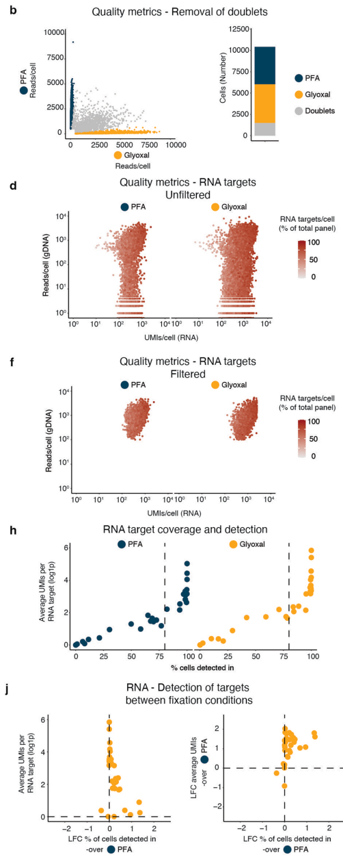 【Droplet-based SDR-seq】部分验证了技术可行性。比较乙二醛和甲醛固定效果发现,乙二醛处理的细胞RNA目标检测率提高1.6倍,而gDNA目标检测保持稳定(82%)。物种混合实验显示RNA交叉污染仅0.8-1.6%,且可通过样本条码校正。