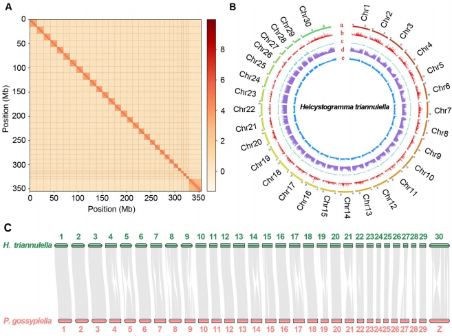 通过17-mer频谱分析预估基因组大小为355.3 Mb,重复序列占比39.4%。最终组装获得387.28 Mb的基因组,contig N50达2.28 Mb, scaffold N50提升至12.75 Mb。Hi-C辅助组装将91.77%序列锚定至30条染色体,与近缘种棉红铃虫(Pectinophora gossypiella)基因组显示高度共线性。