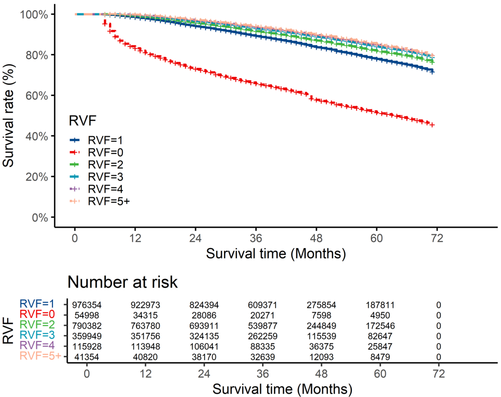 生存率分析:呈现明显的剂量效应关系,无RVFs组死亡率最高(HR=3.23),而RVFs≥5组最低(HR=0.67)。