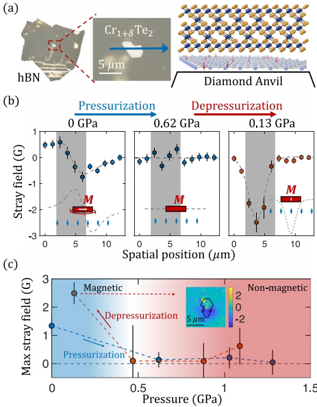 【磁性相变观测】在Cr1+δTe2/hBN异质器件中,VB-传感器成功捕获到0.5 GPa压力下铁磁-顺磁转变的微观证据。 depressurization过程中磁化强度的异常恢复行为,暗示压力可能诱导了磁各向异性翻转。DFT计算证实这种转变源于压力削弱了Cr 3d轨道间的交换作用(J)。