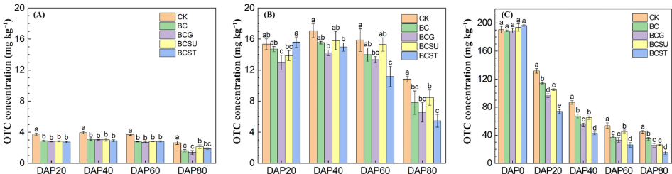 为破解这一难题,Zeng Jiefeng团队设计了一套"吸附-降解"协同策略。研究以生菜(Lactuca sativa)为模式作物,设置5组处理:空白对照(CK)、单独生物炭(BC)、生物炭-葡萄糖(BCG)、生物炭-蔗糖(BCSU)和生物炭-淀粉(BCST),通过80天的温室柱实验(土壤OTC初始浓度200 mg kg-1),结合酶活性检测、微生物生物量分析和植物生长指标测定,系统评估了不同处理对OTC环境行为的调控机制。