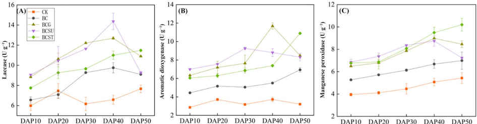 淀粉的缓释特性使其降解效率(92.32%)显著高于葡萄糖(86.58%)和蔗糖(86.47%)。虽然BCG和BCSU在DAP30-40时氧化还原酶活性更高(漆酶达14.36 U g-1),但快速代谢导致后期酶活骤降。而BCST通过持续供碳:(1)维持漆酶活性稳定增长(DAP50达11.48 U g-1);(2)使微生物生物量碳(MBC)持续增加55%;(3)将OTC半衰期从36.48天(CK)缩短至16.91天。