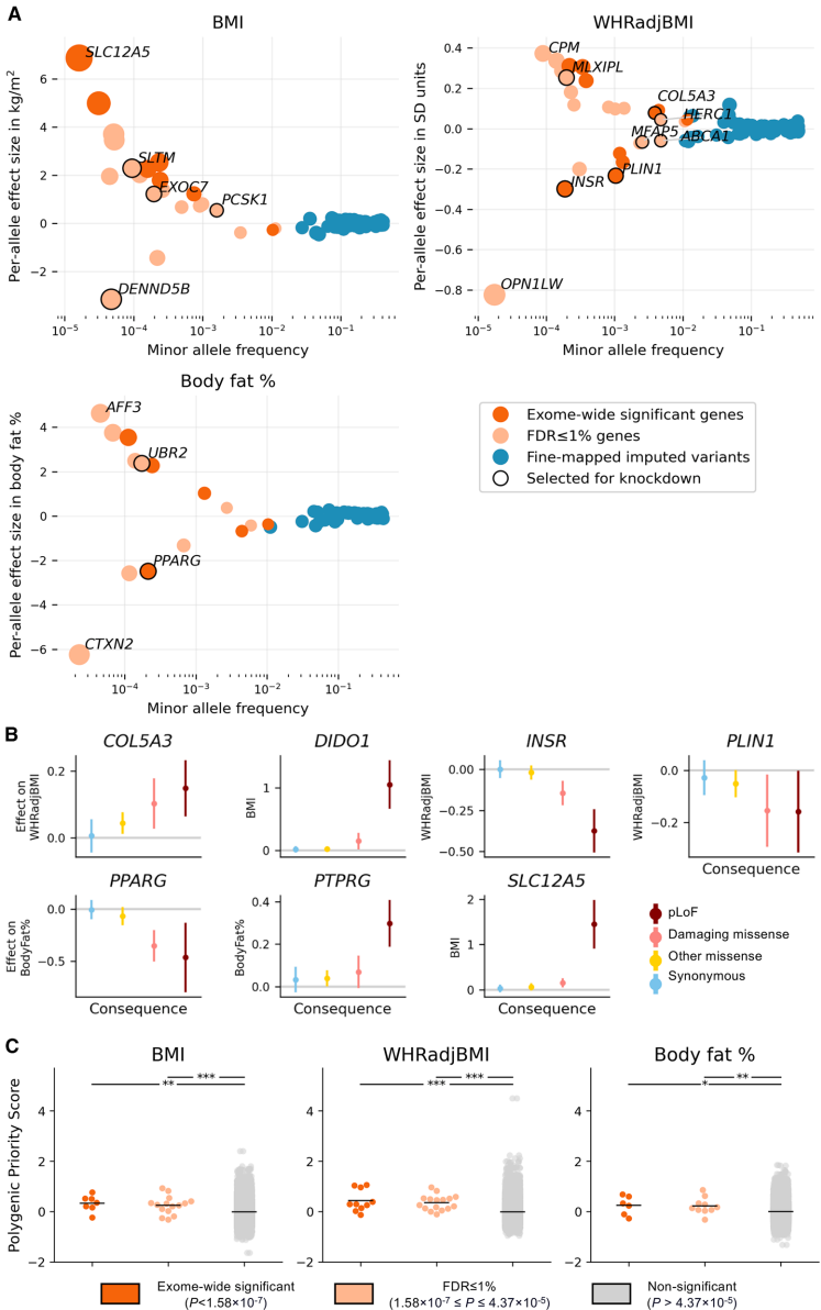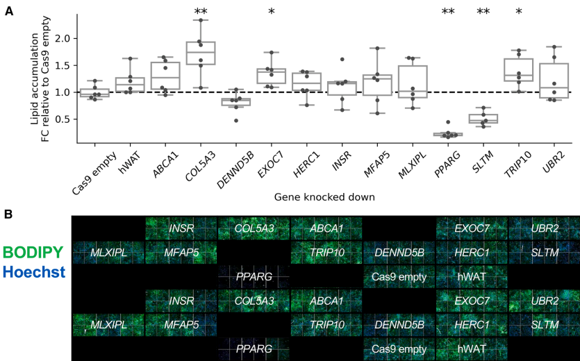 本研究通过结合英国生物银行(UK Biobank)40万欧洲人群的外显子测序数据与CRISPR基因敲除实验,系统鉴定了SLTM、PPARG和COL5A3等调控脂肪积累的关键基因。研究人员创新性地将罕见变异关联分析(SKAT-O p<1.58×10-7)与脂肪细胞功能验证相结合,发现PPARG敲除显著降低脂质积累(FC=0.25),而COL5A3敲除则增加脂质积累(FC=1.72),为肥胖和脂肪分布异常提供了新的治疗靶点。