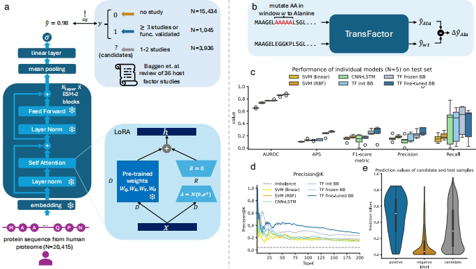TransFactor显著优于传统方法:在测试集AUROC达0.89,较CNN-LSTM模型提升11%。Precision@100达0.37,意味着每验证100个预测靶点可发现37个真实宿主因子,较实验筛选(平均精度0.13)效率提升近3倍。
