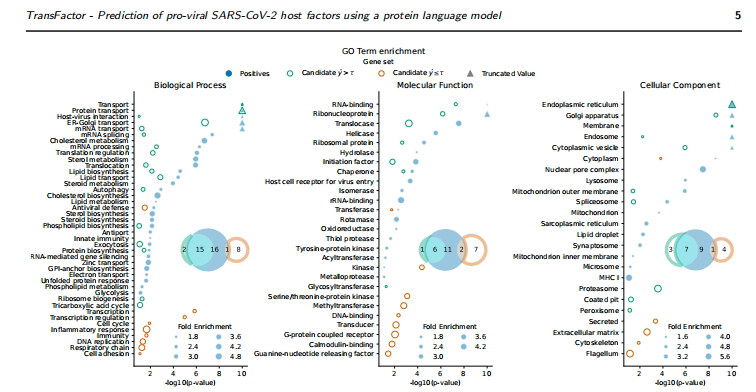 对3,936个候选蛋白的预测显示,高评分候选者与已知宿主因子具有高度一致的GO富集模式(OR=15.0, p<0.0001),如内吞作用调控、RNA结合等通路。这提示模型成功捕捉到宿主因子的功能特征,而非简单记忆序列模式。