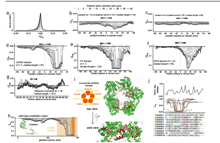 计算丙氨酸扫描揭示:COMM结构域(如COMMD4 172-199位点)的突变导致预测评分下降最显著(Δ?Ala<-0.5),这与COMMD家族蛋白在病毒内体运输中的已知功能吻合。PX和RRM结构域同样被识别为关键区域,而解旋酶结构域等则影响微弱。