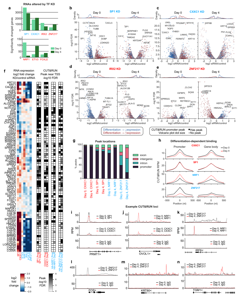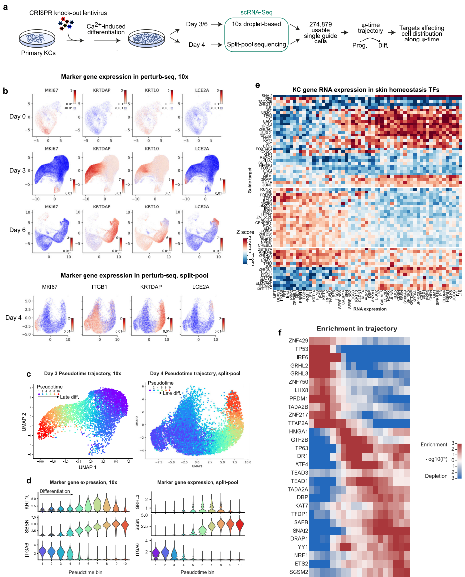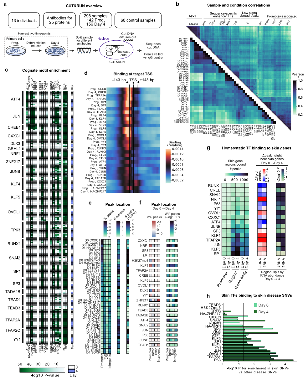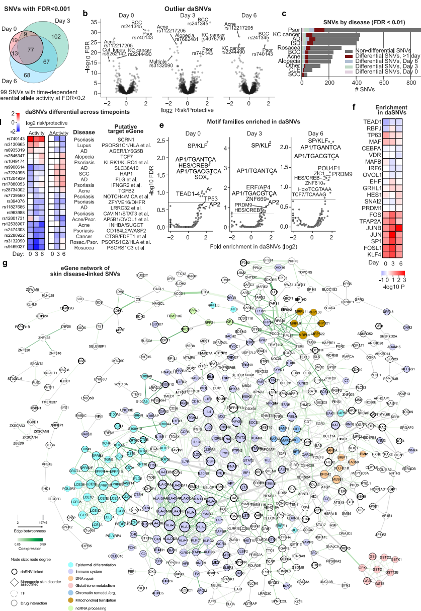 本研究针对多基因皮肤疾病中非编码单核苷酸变异(SNV)如何通过调控转录因子(TF)结合影响基因表达这一关键问题,通过大规模并行报告分析(MPRA)、CRISPR筛选和群体采样CUT&RUN等技术,系统鉴定了355个差异活性SNV(daSNV)和123个表皮稳态必需TF,揭示了AP-1/2和SP/KLF家族转录因子在介导疾病风险变异与表皮分化/炎症基因调控之间的核心作用,为理解多基因皮肤疾病的分子机制提供了重要资源。