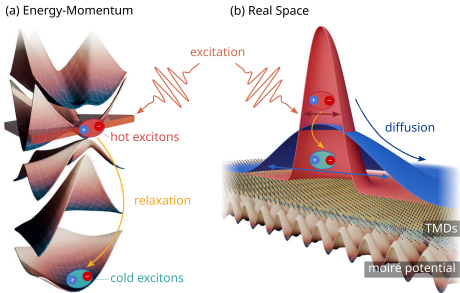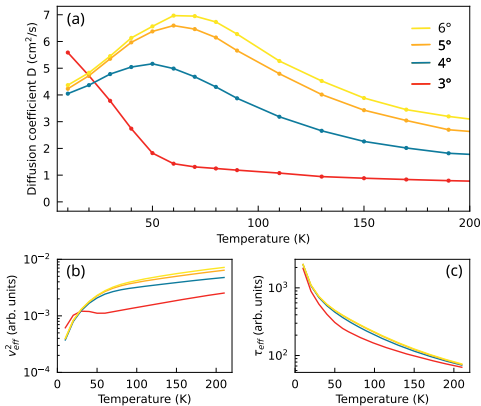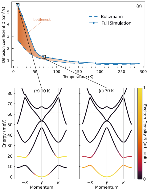 本研究针对摩尔材料中激子热化与空间扩散的耦合动力学缺乏微观理论框架的问题,开展了扭转角调控的TMD异质结构中激子时空动力学研究。通过建立材料特异性的多体模型,意外发现平带通过弛豫瓶颈效应促进热激子形成,反而增强低温扩散(3°扭转角下10K时D=6 cm2/s)。该工作为基于摩尔工程的光电子器件设计提供了理论基石。
