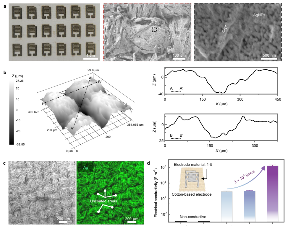 本刊推荐:为解决电子织物(e-textiles)在纤维素基材上难以实现高导电性和保持织物特性的问题,研究团队开发了基于聚-L-赖氨酸(PLL)预处理棉布的碳纳米管(CNT)/反应性银墨水喷墨打印技术。该技术通过CNT构建导电网络促进银离子还原,获得1.25×105 S m-1的高电导率,制备的电阻式触觉传感器灵敏度达6.02 kPa-1,且耐受弯曲、熨烫和机洗,为智能服装提供了新策略。