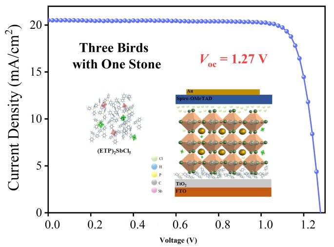 无机钙钛矿太阳能电池(IPSCs)因优异稳定性和潜在应用备受关注,但其效率受界面缺陷和晶格应力影响。研究团队开发零维超分子复合物(ETP)2SbCl5,通过ETP+离子界面钝化缺陷,Sb3+和Cl?离子在退火时进入体材料缓解应力,Cl?在表面钝化阳离子缺陷。改性IPSCs实现21.71%效率、1.27V开路电压,500小时效率衰减仅2.6%。