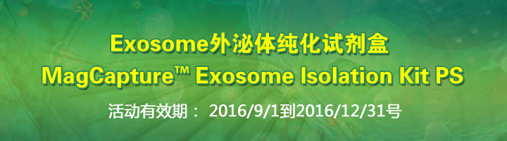 MagCapture™ Exosome Isolation Kit PS采用磁珠和磷脂酰丝氨酸(PS)结合蛋白(PS亲和法)的方法进行纯化。该方法可以很方便获得高纯度的外泌体和其他来自细胞培养基和体液的EVs(通 过正常的微滤方法获得高产量)。如果想要获得更高纯度的外泌体,请使用10,000×g获得上清。该试剂盒利用中性pH的金属螯合试剂,将捕获的EVs从 磁珠上洗脱下来,可以获得完整的外泌体和其他EVs。纯化的完整外泌体和其他EVs可用于不同实验,包括电镜分析,纳米粒子追踪分析,EVs的操作和分析。