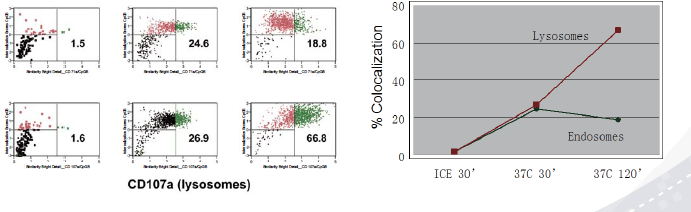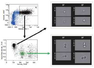 红细胞去核化过程伴随着Glycophorin A(PE)的高效表达和CD71(FITC)的缺失,用ImageStreamX研究红细胞去核化过程,不仅能用上述细胞特征来对正在经历去核化过程的细胞设门,而且能进一步利用细胞的形态和荧光信号的亚细胞定位将其细分为几个不同的去核时期。 |
