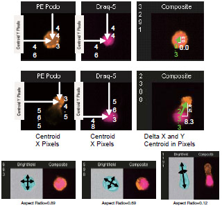 Radial Delta Centroid(RDC):即两色荧光图像的中心间距离,如右图所示,形态均一、成帽以及伪足形成细胞的RDC值依次增大。