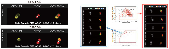4、通过软件分析两个细胞结合部位的ADAP信号占整个细胞ADAP信号的比例,以及ADAP的Aspect Ratio值找出已经形成免疫突触的T细胞与APC双联体,其比例约占整个细胞群体的17.6% |