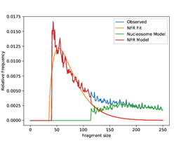 由DNA和组蛋白形成的核小体是构成真核细胞染色质的基本结构单位,每个核小体由146bp的DNA缠绕组蛋白八聚体约1.65圈形成,核小体与核小体之间通过20-50bp的连接DNA相连,DNA与组蛋白的结合并不是固定不变的,没有核小体结合的DNA区域易于各种调节蛋白的接近和结合。在基因组上核小体位置的精确确定称为核小体定位,它的定位变化总是伴随着基因从抑制到转录状态的转变,核小体定位在转录调控、DNA复制和修复等多种细胞过程中有重要研究价值,也是目前表观遗传学研究的热点。结合核小体结构特征和ATAC-Seq插入片段分布进行分析,将插入片段105bp以内的片段判定为NFR区域(核小体缺失区域),将105-250bp插入片段判定为核小体分布区域,进而对核小体进行精准定位。