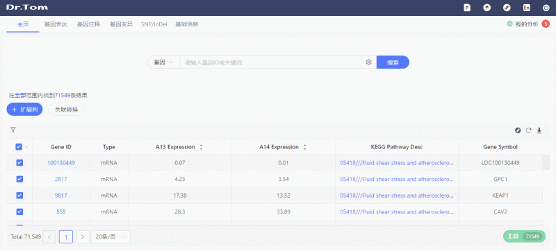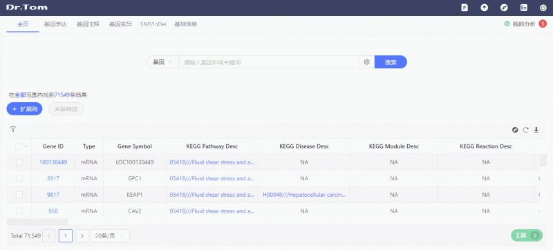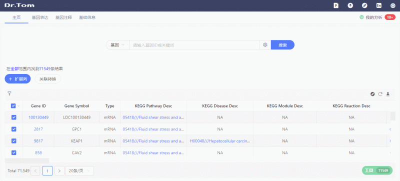 挑选出目的基因,注释和功能是什么?和其他哪些基因有互作?GO、Pathway功能是什么?又有哪些文献支持?在Dr.Tom 2.0中,一键点击即可拉取所有信息。