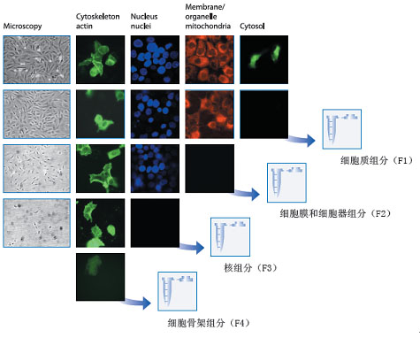 根据亚细胞定位抽提细胞蛋白,获得胞质,膜,细胞核及细胞骨架等四个组分 |