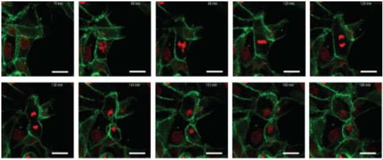 | 图1 细胞分裂过程对光毒性非常敏感。这些图像是摘自细胞分裂过程超过12个小时的时间序列观察记录结果。图像的采集是每三分钟获取一组图像,每组图像由45个z轴光切片组成(一共约22500幅图像)。图中的图像是被H2B-mRFP(红色)和Nb65-GFP(绿色)转染的MDCK细胞的共聚焦单一切片。图中标尺:20μm,实验过程中只观察到极小的光毒性。图像由法国巴斯特研究所,Vasily Shinin博士提供。 |