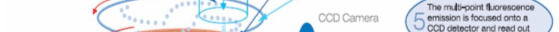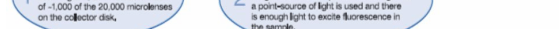 微透镜增强型的Nipkow转盘系统的核心,是在Nipkow双转盘中的一个转盘上,制作了20000个呈椭圆形分布的针孔。在同一时间,有1000个针孔可被激光照射。所以,被观察样本可被1000个小光束同时激发。在双转盘的另一个转盘上的微透镜,与上述的20000个针孔精准的对齐准直,并将激光光束聚焦到被观察的样本上,这种设计将激光光源的透射效率从1%提高到约60%。在高速旋转的速率下,1000个小光束可以1000帧/秒的速率扫描整个被观察的样本,即以1帧/毫秒的速率扫描被观察的样本。 |