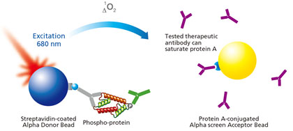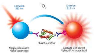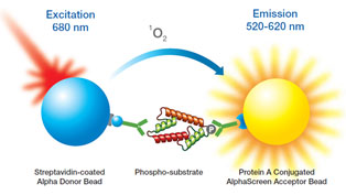 供体微珠和受体微珠结合在一起,经过一系列化学反应,使细胞内源性蛋白磷酸化信号增强而被检测到。配合细胞转染技术,可以完成高敏感度的各种信号通路、受