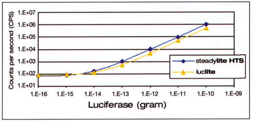 | 图3. 使用DPBS/0.1% BSA中梯度稀释荧光素酶,使用PerkinElmer TopCount NXT Microplate Scintillation and Luminescence Counter,在白色96孔OptiPlate中测量。相比luclite,steadylite HTS检测的底限更低。 |