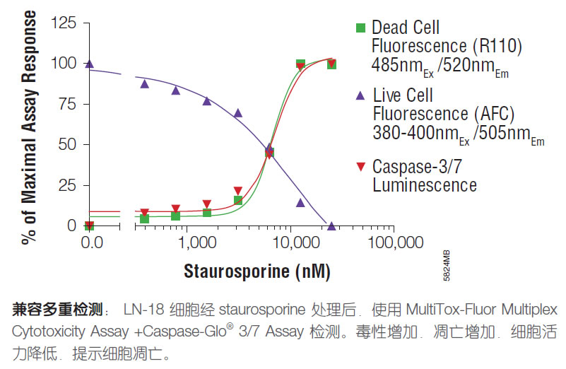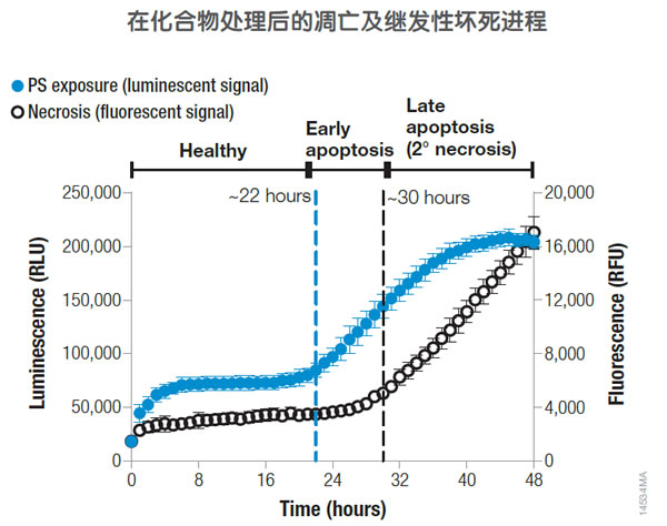 RealTime-Glo™ Apoptosis and Necrosis Assay 是一种简单,非裂解性的实时监测凋亡进程的方法。无需处理多重多孔板,复杂的处理过程和特殊的检测仪器。只需具有发光和荧光检测功能的多功能读板仪即可。此方法的原理是检测磷脂酰丝氨酸(PS) 膜外翻来检测凋亡和检测膜完整性的丧失来测定继发性坏死。通过一个简单的发光信号来检测Annexin V 结合,通过一个荧光信号的检测来测定坏死。