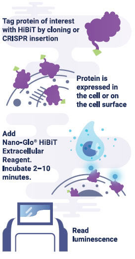 | Nano-Glo® HiBiT 胞外检测系统可定量细胞表面和细胞外分泌的蛋白表达, 仅需“ 加样- 混合- 检测”的简单操作,即可在几分钟内完成定量。任何与HiBiT 标签融合表达在胞外的蛋白,都可使用非裂解性Nano-Glo® HiBiT 胞外检测试剂进行检测。 |