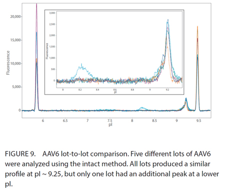利用Maurice icIEF自发荧光监测批次间变异,以鉴别病毒载体批间差别。五批不同的AAV6,使用 Maurice icIEF自发荧光分析。结果显示,所有五个批次在pI〜9.25左右均产生相似的峰形。但是,在一批中观察到了一个较低pI的附加峰,表明该样品与其他四批样品不同。 |