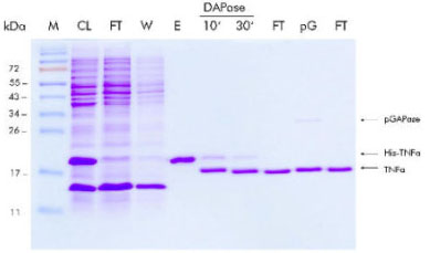 His-tagged TNFα 利用Ni-NTA纯化后,与DAPase孵育30分钟,M: 分子量标准 CL: 细胞裂解物 FT: 流出组分 W: 洗涤组分 E: 洗脱组分 |