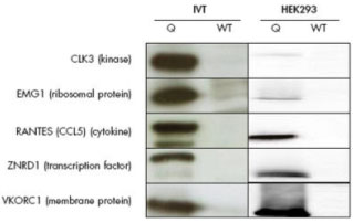 The optimized QIAgenes (Q) and wild-type (WT) coding sequences of the indicated proteins were cloned into QIAgene Expression Constructs and expressed in vitro (IVT) or in HEK293 cells (HEK293). |