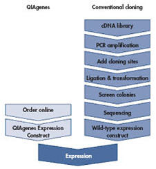 订购 QIAgenes Expression Kit可以直接获得优化和预制好的表达载体,省去了传统流程中的文库筛选,PCR扩增,亚克隆,克隆筛选,测序等繁琐步骤(见以下流程图)。