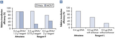 图 1. Attractene效率更高. DNA (pGFP which expresses green fluorescent protein) was transfected into the cell types indicated using Attractene Reagent. Transfection were also performed with A Reagent F or B Reagent L according to the manufacturer’ handbooks. Transfection efficiency was estimated by counting the number of fluorescent cells by FACS® analysis. Transfection efficiency is expressed relative to efficiency using Attractene Reagent which was set at 100%. |