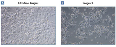 图2. Attractene 毒性极低。HepG2 cells were transfected with DNA (pGFP) using Attractene Transfection Reagent or Reagent L from another supplier according to the manufacturer's instructions. Two days after transfection, cells were examined by light microscopy. Cells transfected using Attractene Reagent were healthy and viable. In contrast, cells transfected using Reagent L displayed high levels of cell death.