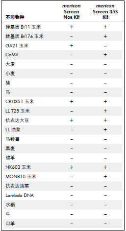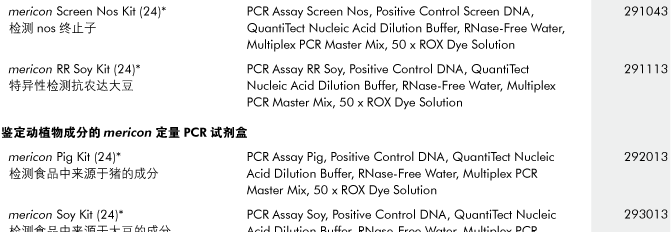 确定食品中转基因生物(GMO)的存在需要检测转基因和同源转基因生物的遗传物质。Real-time PCR 技术特异检测目标DNA 序列,是检测食品中来源于GMO 物质存在的首选方法。mericon PCR 试剂盒含有特有靶定常用遗传物质的引物和探针,如nos 终止子和35S 启动子。因此,这些检测为广泛使用GMO 的存在带来了决定性的检测信号(表1)。对于某一特定GMO 的鉴定,mericon 食品检测产品线包含了一套检测,能靶定多种GMO 中每个独特的DNA 序列,如Roundup Ready 抗农达大豆、Bt11 玉米或MON810 玉米。这些试剂盒的检测是高度灵敏且特异的。 |