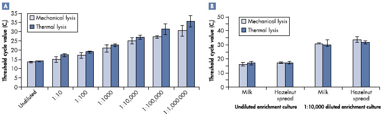 Plus Kit 的机械(微珠)裂解试验方案或mericon DNA Bacteria Kit 的热(煮沸)裂解试验方案进行操作,以评估裂解效率。对于这种革兰氏阳性菌,机械裂解使提取效率更高,这在细菌浓度极低(最高稀释)时最为明显,机械裂解的平均循环阈值数要低4.9。nB 在一个相似的实验中,将牛奶和榛子酱中的肠道沙门氏菌(Salmonella enterica)扩增培养物的稀释和未稀释样本按照机械和热裂解试验方案进行处理。总的来说,两种制备方法对于革兰氏阴性菌的DNA 提取效率相当。 |
