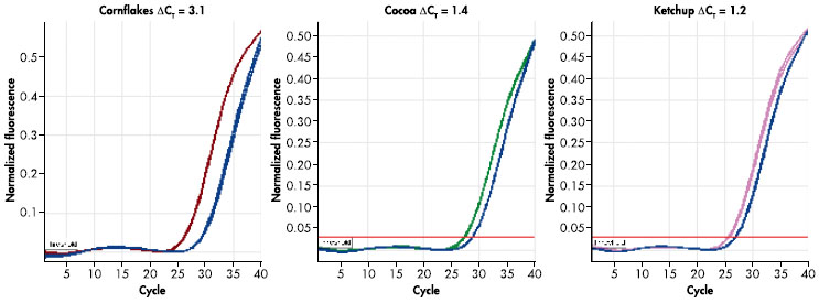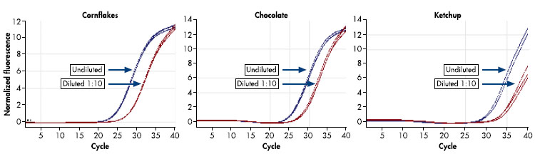 | 图9. 使用DNeasy mericon Food Kit 高效制备DNA。使用DNeasy mericon Food Kit 制备困难食品类型的样本,用于分析。玉米片和番茄酱是高度加工的食品,其DNA 严重片段化,并且番茄酱含醋,酸性较高。巧克力包含了几种强的PCR 抑制剂。通过叶绿体tRNA 基因trnL 的扩增,扩增曲线显示了植物DNA 的成功检测。每条曲线是样本制备的一次重复。以纯的DNA 开展,当样本以1:10 稀释时,此分析的循环阈值数(CT)有着2.9–3.5 的阳性变化。未稀释样本和稀释样本的阈值循环CT 变化落在此范围内,说明在DNA 制备中抑制剂的去除率很高。 |