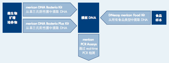mericon™ 食品检测产品线是一整套分析试剂盒,它们能满足上述要求。基于real-time PCR 的检测,mericon PCR Assays 和样本制备试剂盒实现了对食品、动物饲料或药品中多种病原体、转基因生物、过敏原及动植物成分的快速、可靠检测。QIAGEN 产品的主要优势在于和谐的检测步骤,流程仅仅在样本制备方法上不同(图1)。QIAGEN 提供专为处理多种食品材料而设计的新样本制备方案,提高整体流程性能。这些样本制备试剂盒从微生物扩增培养物或直接从各种食品基质中高效提取DNA,并且降低复杂食品样本中固有的PCR 抑制剂残留。