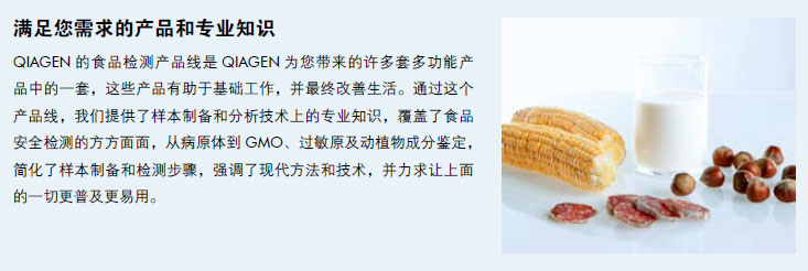在生产过程中,食品受到热、辐射、高压及pH 变化的影响,这些会导致DNA 降解和片段化。我们开发出DNeasy mericon Food Kit 的优化试剂,以便回收短的DNA 片段(低至100 bp),确保即使高度片段化的DNA 也能有效分离,并随后在PCR 中扩增。正因为这些特征,DNeasy mericon Food Kit 成为一种普遍适用的提取方法,即使是处理高度加