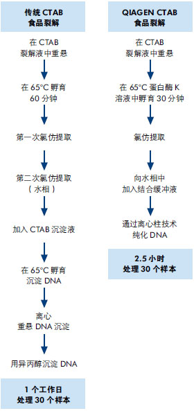 我们的样本制备试剂盒能够从多种样本类型中提取DNA,包括微生物扩增培养物或原始或经加工的食品材料。特别值得一提的是DNeasy® mericon Food Kit 是改良CTAB 提取法。非离子去污剂CTAB 广泛用于从多种组织类型中高效提取总的胞内核酸。CTAB 可高效释放并与DNA结合或去除胞内抑制剂。但与耗费劳力的传统CTAB 提取步骤相比,DNeasy mericon Food Kit 的步骤明显加快,能在2.5 小时内处理最多30 个样品,且从根本上减少流程步骤数(图2)。提取出的DNA 与传统CTAB 法提取出的在质量和纯度上相当。 |